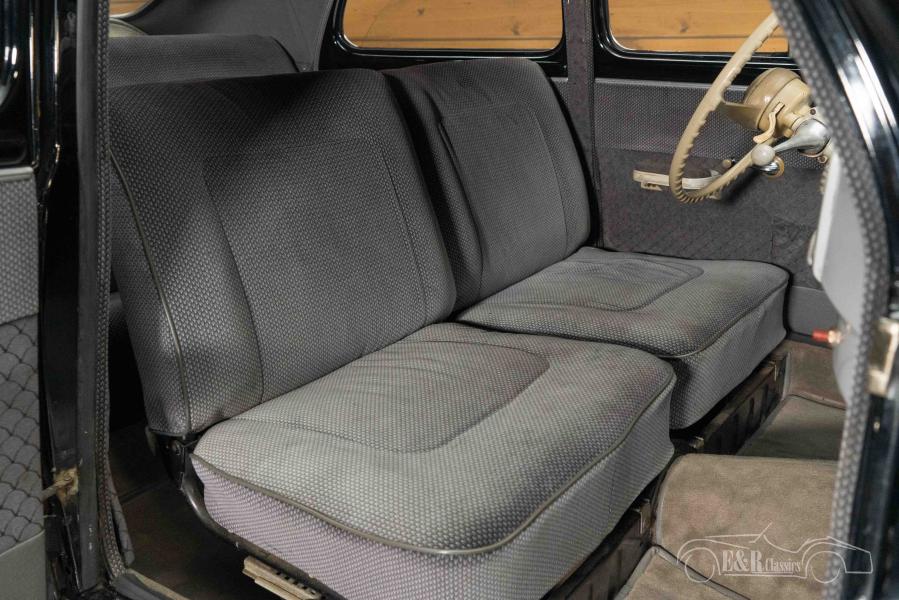 The exterior of this Peugeot 203 C is finished in stylish black paintwork that shines beautifully and fits in well with the timeless design of the car. The classic steel rims with chrome hubcaps emphasize the original character, while the moldings and grille work radiate a subtle elegance. Inside you will find a surprisingly spacious interior with two comfortable sofa seats, upholstered in grey fabric with a fine pattern that perfectly matches the dashboard and the large steering wheel with ivory-coloured details. The Peugeot is also equipped with a sliding roof so that you can enjoy the fresh air while touring.