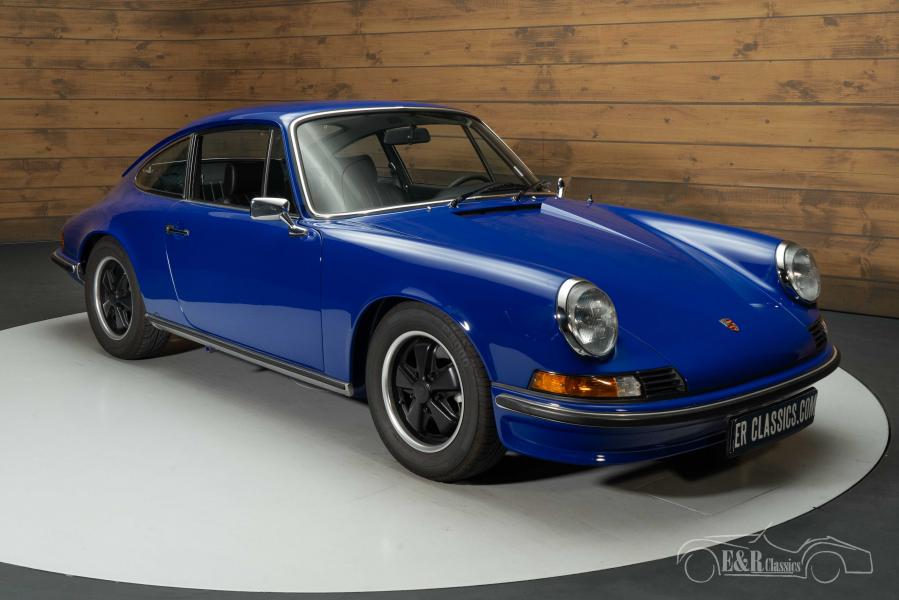 The bodywork is finished in a striking blue paint that contrasts beautifully with the sleek black leather interior. The original Fuchs rims complete the timeless silhouette and emphasize the sporty elegance of this model. Inside, the interior exudes the same class, with beautifully restored upholstery, a classic dashboard and original details that harmonize perfectly with the exterior. This Porsche 911T combines aesthetics, craftsmanship and history for a unique driving experience.