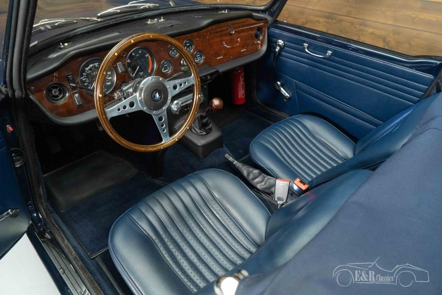 What makes this Triumph TR250 extra special is its stylish Triple Blue version: a deep dark blue paintwork combined with a dark blue soft top and a matching dark blue interior. The sporty Minilite rims and extra spotlights at the front emphasise its classic rally look. Inside, the wooden dashboard, the wooden sports steering wheel and the wooden gear knob create a warm and luxurious atmosphere that perfectly matches the exterior. A stylish and extremely rare classic for the true enthusiast.