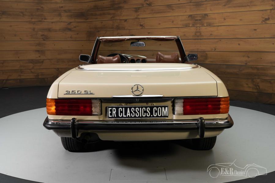 Lo que distingue a este Mercedes-Benz 350 SL del resto es su atractiva paleta de colores. Tiene una pintura beige y un interior marrón oscuro. El interior combina a la perfección con esta pintura, y la capota de lona marrón oscuro también encaja a la perfección con el conjunto. La pintura y el interior presentan algunos signos de desgaste.