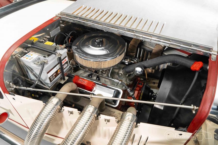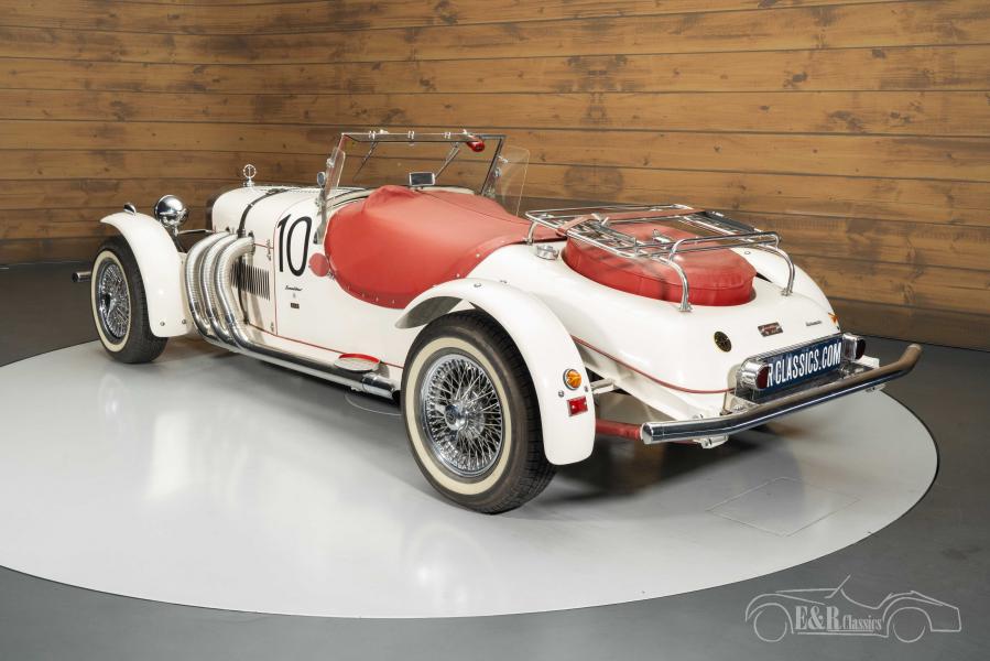 Visualmente, este Excalibur SSK irradia elegancia y deportividad. La pintura blanca contrasta a la perfección con el interior rojo burdeos y la cubierta roja a juego. Los detalles clásicos destacan de inmediato: llantas de radios con neumáticos de banda blanca, volante deportivo Moto-Lita y los distintivos tubos laterales dobles que le otorgan al coche su carácter inconfundible. Combinados con detalles cromados y el capó alargado, el resultado es una apariencia nostálgica y potente a la vez. Una auténtica pieza de coleccionista para los amantes de los clásicos exclusivos.