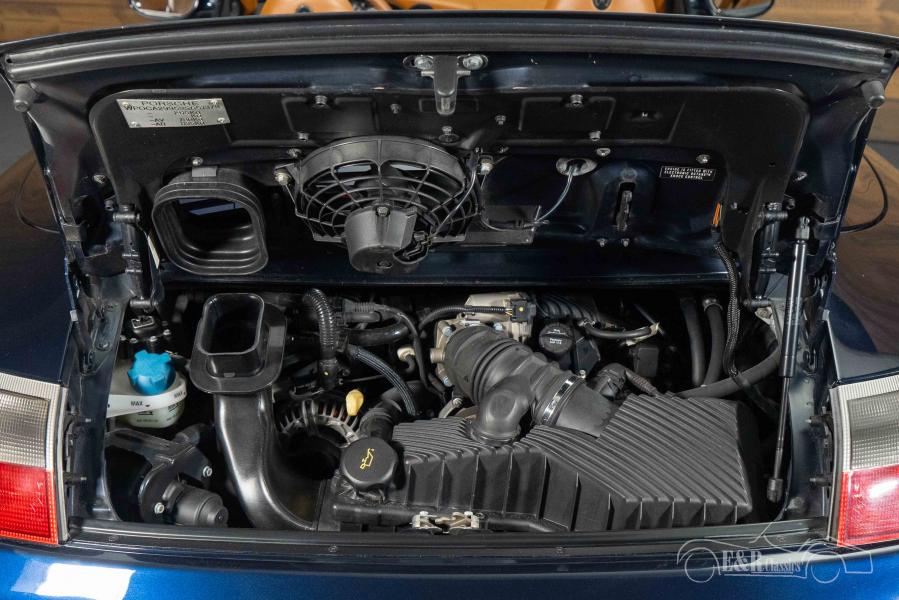In terms of appearance, this 911 exudes pure class with its dark blue paintwork, matching dark blue soft top, and sporty red brake calipers behind the Porsche rims. The brown leather interior provides a stylish contrast and offers plenty of luxury with power-adjustable seats with seat heating, air conditioning, cruise control, power mirrors and windows, and a high-quality Bose sound system. All of this makes this Porsche an ideal blend of sportiness, comfort, and character.