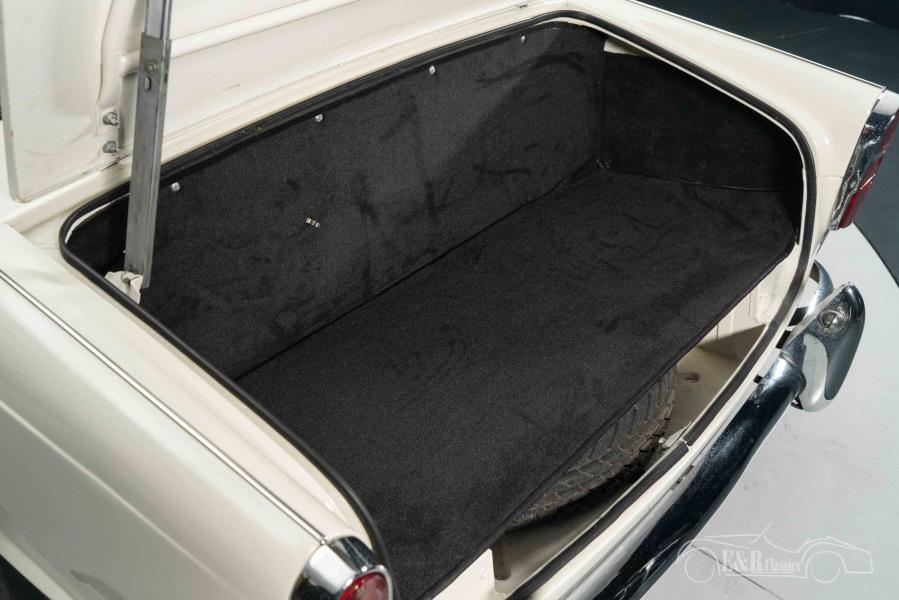 The exterior features stylish Old English White paintwork that contrasts beautifully with the black soft top. A luggage rack with a classic trunk is located at the rear, giving the car a charming vintage look. The original steel wheels with chrome details complete the timeless design. Inside, we find luxurious bucket seats with headrests in black leatherette, a wooden dashboard with classic instruments, and a sporty steering wheel. The interplay of wood, chrome, and leather creates a warm, authentic atmosphere that perfectly suits the character of this British roadster.