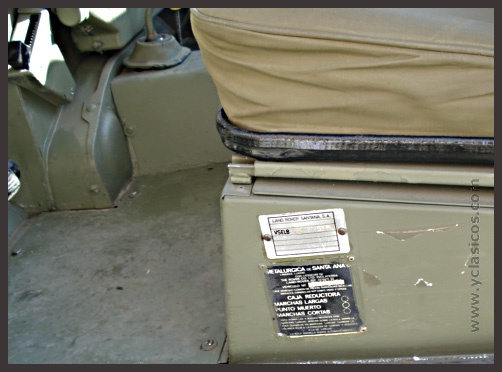 Las placas en el lateral bajo del asiento del lado conductor - Por un lado tienes la placa original de Land rover con su número de chasis y por otro la informativa de cambio de tracción a 4x4 y marchas cortas.