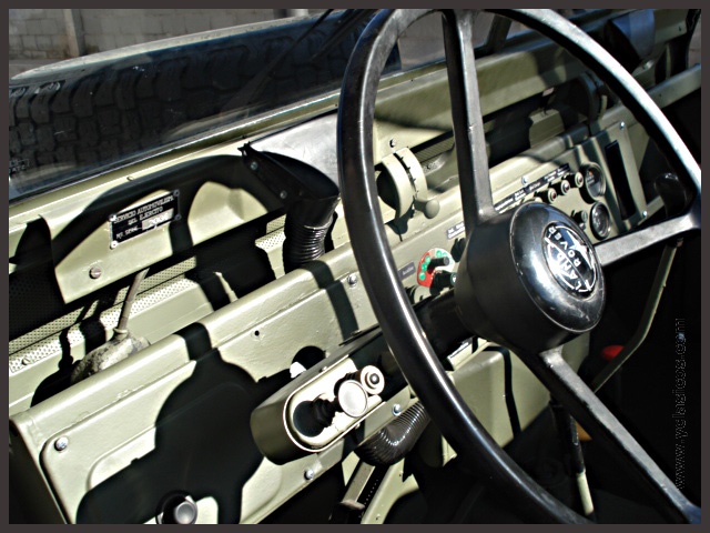 El tablier también ha tenido mejoras. En el volante una tapa muy rara y antigua de Land Rover (tratare de hacerle otra foto que se vea mejor), algunas zonas que estaban pintadas de negro, ahora de verde. El cuadro de instrumentos más limpio y con todos los cartelitos de funcionamiento perfectos. Y una chapa original del vehículo con su número de ejercito de tierra. (siguiente foto)