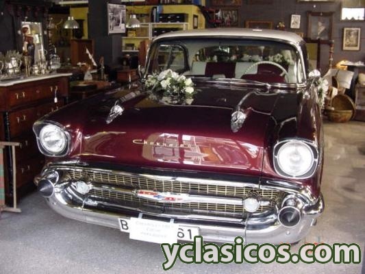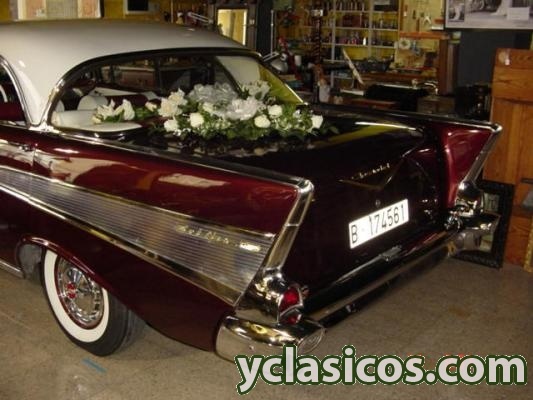 Chevrolet Bel Air de 1957, "nacional", (importado en España en su año de fabricación). Tiene la matrícula original de Barcelona, y velocímetro en kilómetros. Restaurado de carrocería, tapicería, bajos, cromados, moqueta, instalación eléctrica etc. hace unos años, y cuidado con mimo, el automóvil tiene un aspecto precioso, y está perfectamente sano. El motor original Blue Flame, de 6 cilindros en línea, cuatro litros, de gasolina, se ha rehecho completamente en 2009. Un excelente ejemplar del clásico más famoso de los años 50.