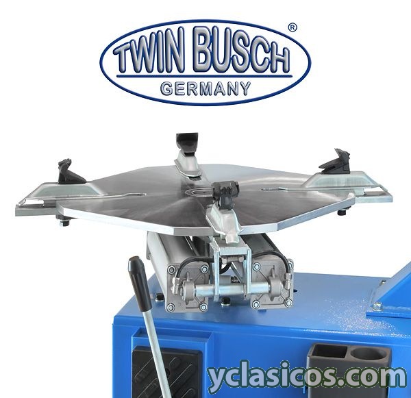 Plato con cuatro garras para amarre de la llanta mediante dos cilindros neumáticos.