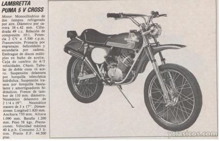 Motor. Monocilíndrico de dos tiempos refrigerado por aire. Diámetro por carrera 38 x 42 mm. Cilindrada 49 ce. Relación de compresión 10:1. Potencia 2 CV a 5.500 r.p.m. Transmisión. Primaria por engranajes helicoidales y secundaria por cadena. Embrague de discos múltiples en baño de aceite. Caja de cambio de 4/5 velocidades. Chasis. Tubular de doble cuna en acero. Suspensión delantera por horquilla telescópica hidráulica. Suspensión trasera por horquilla basculante y amortiguadores hidráulicos. Frenos de tambor de 110 mm. diámetro. Neumático delantero de 2 1/4 x 19". Neumático trasero de 3 x 17". Dimensiones. Longitud 1.820 mm.Anchura 750 mm. Altura 1.090 mm. Batalla 1.200 mm. Peso 58 kgs. Prestaciones. Velocidad máxima 40 k.p.h. Consumo 2,5 litros.