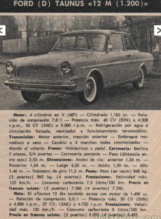 Nota: El Taunus 12 M también existe con motor de 1.498 cc. Relación de compresión 8,0:1. Potencia máx. 50 CV (DIN) a 4.500 r.p.m., 57 CV. (SAE) a 4.750 r.p.m. Prestaciones: Velocidad máx. 130 km./h. Consumo carburante 8 litros/100 km.