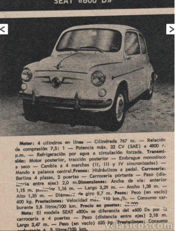 Nota: El modelo SEAT «800» se diferencia del «600 D» por la carrocería a 4 puertas. Paso (distancia entre ejes) 2,18 m. Largo 3,47 m. Peso (en vacío) 635 kg Prestaciones: Consumo carburante 6, 3 lttros/100 km.