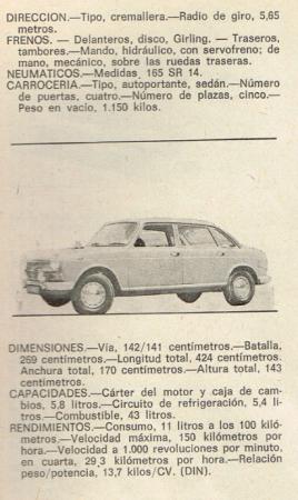 RENDIMIENTOS: Consumo, 11 litros a los 100 kilómetros. Velocidad máxima, 150 kilómetros por hora. Velocidad a 1.000 revoluciones por minuto, en cuarta, 29.3 kilómetros por hora. Relación peso/potencia,13,7 kilos/CV. (DIN).