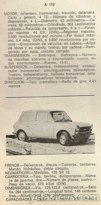 MOTOR: delantero, transversal; tracción, delantera. Ciclo y género, 4 TG. Número de cilindros y disposición, 4 L. Diámetro, 65 mil ímetros. Carrera, 68 milímetros. Cilindrada, 903 centímetros cúbicos. Relación de compresión, 9 a 1. Potencia máxima. 44 CV. (DIN). Régimen máximo. 5.600 revoluciones por minuto. Par motor máximo, 6,4 mkg. (DIN), a 3.800 revoluciones por minuto . Disposición de válvulas, en cabeza. Arbol de levas y su mando, lateral, por cadena. Refrigerado por agua, circuito cerrado.