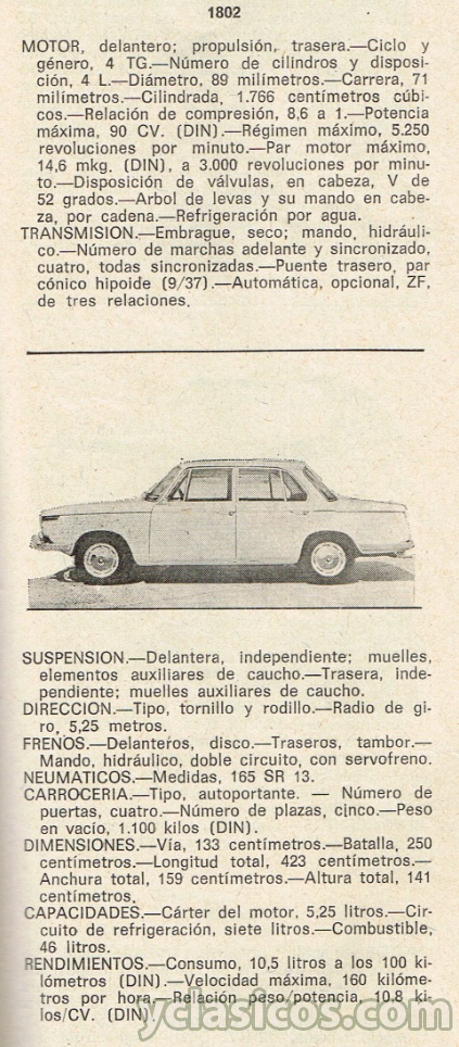 MOTOR: delantero; propulsión, trasera. Ciclo y género, 4 TG. Número de cilindros y disposición, 4 L. Diámetro. 89 milímetros. Carrera, 71 milímetros. Cilindrada. 1.766 centímetros cúbicos. Relación de compresión. 8.6 a 1. Potencia máxima. 90 CV. (DIN). Régimen máximo, 5.250 revoluciones por minuto. Par motor máximo, 14,6 mkg. (DIN), a 3.000 revoluciones por minuto. Disposición de válvulas, en cabeza, V de 52 grados. Arbol de levas y su mando en cabeza, por cadena. Refrigeración por agua.