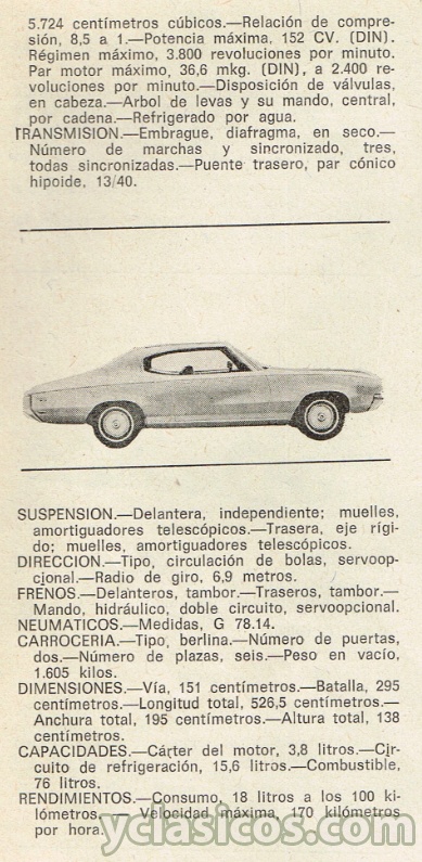 MOTOR:  delantero; propulsión, trasera. Ciclo y género, 4 TG. Número de cilindros y disposición. 8. en V de 90 grados. Diámetro, 96,52 milímetros.  Carrera, 97,79 milímetros. Cilindrada. 5.724 centímetros cúbicos. Relación de compresión, 8,5 a 1. Potencia máxima, 152 CV. (DIN). Régimen máximo. 3.800 revoluciones por minuto. Par motor máximo, 36,6 mkg. (DIN), a 2.400 revoluciones por minuto. Disposición de válvulas, en cabeza. Arbol de levas y su mando, central, por cadena. Refrigerado por agua.