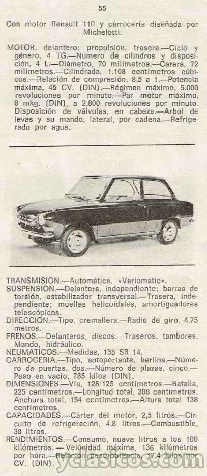 MOTOR: delantero; propulsión, trasera. Ciclo y género. 4 TG. Número de cilindros y disposición, 4 L. Diámetro. 70 milímetros. Carera, 72 milímetros. Cilindrada. 1.108 centímetros cúbicos. Relación de compresión, 8.5 a 1. Potencia máxima, 45 CV. (DIN). Régimen máximo, 5.000 revoluciones por minuto. Par motor máximo, 8 mkg. (DIN), a 2.800 revoluciones por minuto. Disposición de válvulas, en cabeza. Arbol de levas y su mando, lateral, por cadena. Refrigerado por agua.