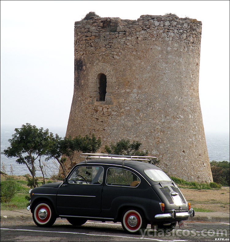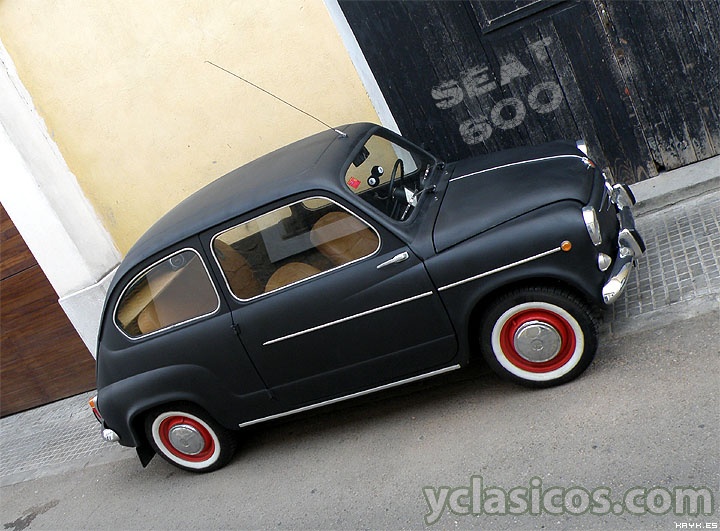 Alquilo Seat 600D estilo "Cal-Look", pintado de negro mate con llantas rojas y neumáticos con banda blanca, interior en piel color ocre, muy bonito y cómodo.