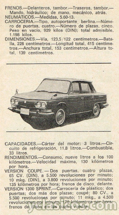 VERSION COUPE: Dos puertas, cuatro plazas, 65 CV. (DIN), a 5.500 revoluciones por minuto; 10 mkg. (DIN), a 3.800 revoluciones por minuto; 135 kilómetros por hora; frenos de disco, delante.