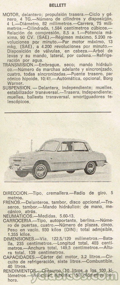 MOTOR: Delantero; propulsión trasera Ciclo y género, 4 TG. Número de cilindros y disposición, 4 L. Diámetro, 82 milímetros. Carrera, 75 milímetros. Cilindrada, 1.584 centímetros cúbicos. Relación de compresión, 8,5 a 1. Potencia máxima, 90 CV. (SAE). Régimen máximo, 5.200 revoluciones por minuto. Par motor máximo, 13 mkg. (SAE), a 4.200 revoluciones por minuto. Disposición de válvulas, en cabeza. Arbol de levas y su mando, lateral, por cadena. Refrigeración por agua.