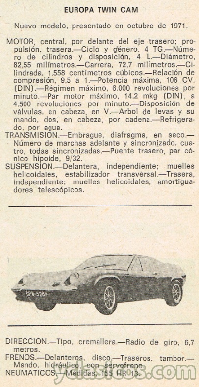 MOTOR: central, por delante del eje trasero; propulsión, trasera. Ciclo y genero, 4 TG. Número de cilindros y disposición. 4 L. Diámetro, 82,55 milímetros. Carrera. 72.7 milímetros. Cilindrada. 1.558 centímetros cúbicos. Relación de compresión, 9,5 a 1. Potencia máxima. 106 CV. (DIN). Régimen máximo, 6.000 revoluciones por minuto. Par motor máximo. 14,2 mkg (DIN), a 4.500 revoluciones por minuto. Disposición de válvulas, en cabeza, en V. Arbol de levas y su mando, dos, en cabeza, por cadena. Refrigerado, por agua.