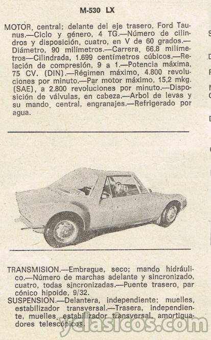 MOTOR: central; delante del eje trasero. Ford Taunus. Ciclo y género, 4 TG. Número de cilindros y disposición, cuatro, en V de 60 grados. Diámetro, 90 milímetros. Carrera, 66.8 milímetros Cilindrada, 1.699 centímetros cúbicos. Relación de compresión, 9 a 1. Potencia máxima. 75 CV. (DIN). Régimen máximo, 4.800 revoluciones por minuto. Par motor máximo, 15,2 mkg. (SAE), a 2.800 revoluciones por minuto. Disposición de válvulas, en cabeza. Arbol de levas y su mando, central, engranajes. Refrigerado por agua.