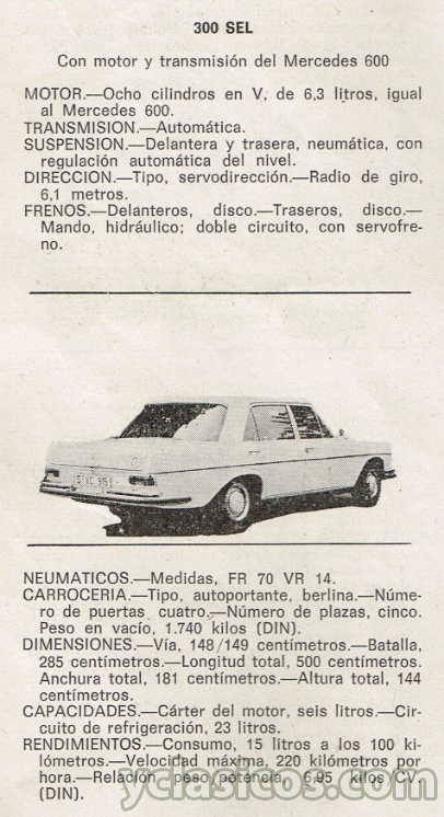 MERCEDES 300 SEL - Ficha Técnica de época 1972
