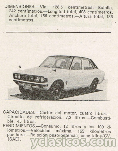 RENDIMIENTOS: Consumo, 12 litros a los 100 kilómetros. Velocidad máxima. 165 kilómetros por hora Relación peso/potencia, ocho kilos/CV. (SAE).