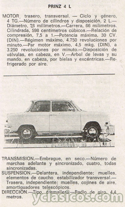 VERSION SPORT PRINZ: Coupé. dos más dos plazas; frenos delanteros, de discos; longitud. 356 centímetros; anchura. 152 centímetros; altura. 123,5 centímetros; velocidad. 130 kilómetros por hora: consumo. 5.3 litros a los 100 kilómetros (DIN).