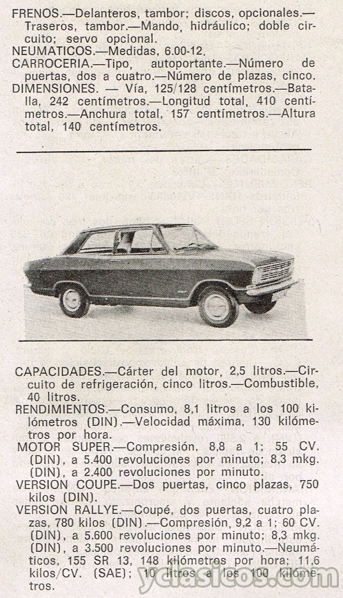 VERSION RALLYE: Coupé, dos puertas, cuatro plazas, 780 kilos (DIN). Compresión, 9,2 a 1; 60 CV. (DIN), a  5.600 revoluciones por minuto; 8,3 mkg. (DIN), a 3.500 revoluciones por minuto. Neumáticos. 155 SR 13, 148 kilómetros por hora; 11,6 kilos/CV. (SAE); 10 litros a los 100 kilómetros.