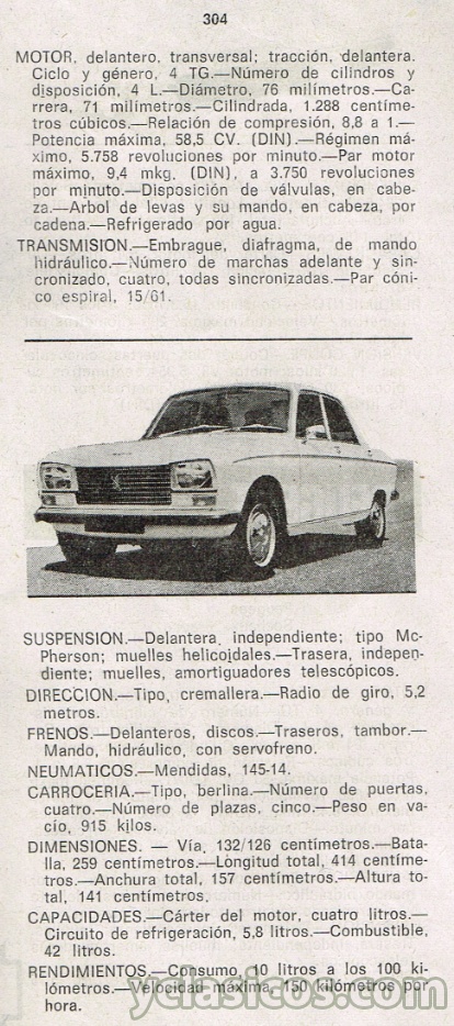 PEUGEOT 304 - Ficha Técnica de época 1972