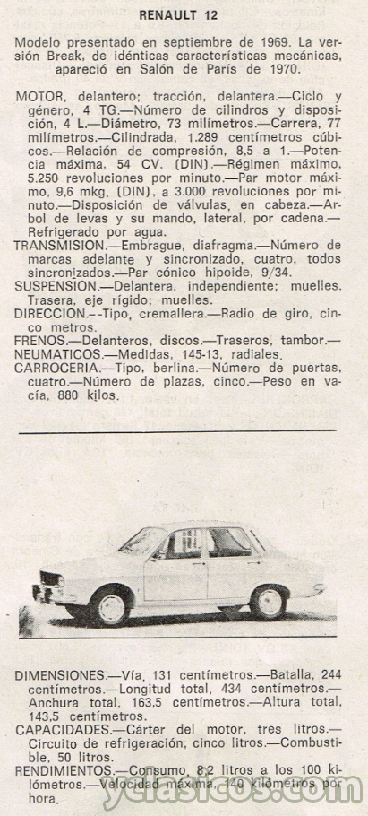MOTOR: delantero; tracción, delantera. Ciclo y género. 4 TG. Número de cilindros y disposición, 4 L. Diámetro. 73 milímetros. Carrera, 77 milímetros. Cilindrada. 1.289 centímetros cúbicos Relación de compresión, 8.5 a 1. Potencia máxima, 54 CV. (DIN). Régimen máximo, 5.250 revoluciones por minuto. Par motor máximo. 9,6 mkg. (DIN), a 3.000 revoluciones por minuto. Disposición de válvulas, en cabeza. Arbol de levas y su mando, lateral, por cadena. Refrigerado por agua.