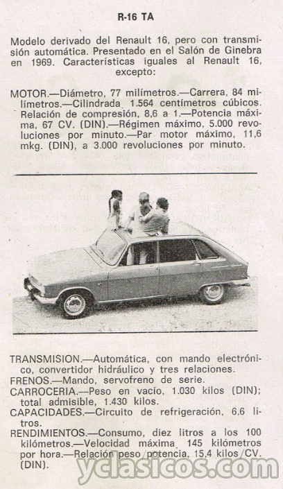 RENAULT 16 TA - Ficha Técnica de época 1972