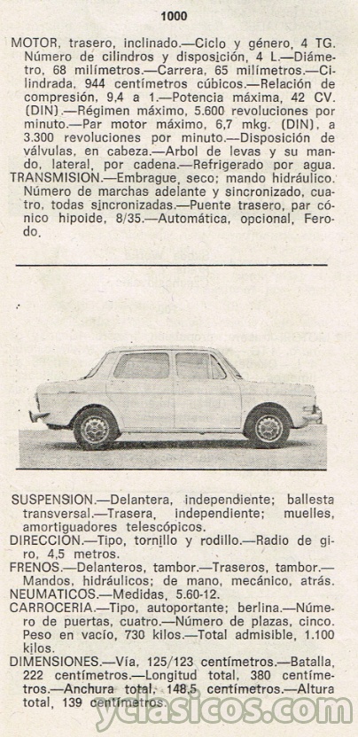 MOTOR: trasero, inclinado. Ciclo y género, 4 TG. Número de cilindros y disposición, 4 L. Diámetro. 68 milímetros. Carrera, 65 milímetros. Cilindrada. 944 centímetros cúbicos. Relación de compresión. 9.4 a 1. Potencia máxima, 42 CV. (DIN). Régimen máximo, 5.600 revoluciones por minuto. Par motor máximo. 6,7 mkg. (DIN), a 3.300 revoluciones por minuto. Disposición de válvulas, en cabeza. Arbol de levas y su mando, lateral, por cadena. Refrigerado por agua.