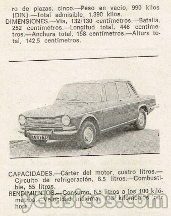 MOTOR: delantero; propulsión trasera. Ciclo y género, 4 TG. Número de cilindros y disposición, 4 L. Diámetro, 74 milímetros. Carrera, 75 milímetros. Cilindrada, 1.290. centímetros cúbicos. Relación de compresión, 8,8 a 1. Potencia máxima, 60 CV. (DIN). Régimen máximo, 5.200 revoluciones por minuto. Par motor máximo, 9,3 mkg. (DIN), a 2.600 revoluciones por minuto. Disposición de válvulas, en cabeza. Arbol de levas y su mando, lateral, por cadena. Refrigerado por agua.