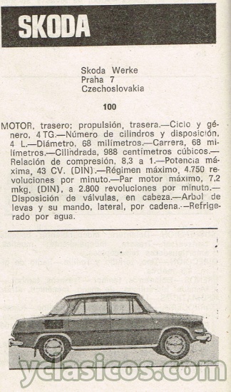 MOTOR: trasero; propulsión, trasera. Ciclo y género. 4TG. Número de cilindros y disposición, 4 L. Diámetro, 68 milímetros. Carrera, 68 milímetros. Cilindrada. 988 centímetros cúbicos. Relación de compresión, 8.3 a 1. Potencia máxima, 43 CV. (DIN). Régimen máximo. 4.750 revoluciones por minuto. Par motor máximo. 7,2 mkg. (DIN), a 2.800 revoluciones por minuto. Disposición de válvulas, en cabeza. Arbol de levas y su mando, lateral, por cadena. Refrigerado por agua.