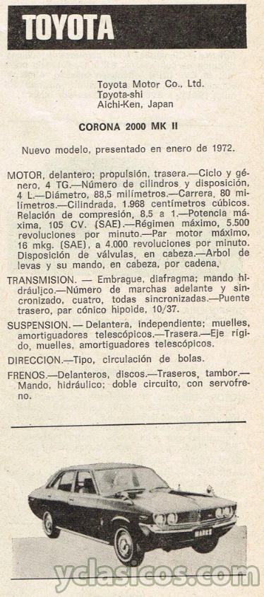 TOYOTA CORONA 2000 MK II - Ficha Técnica de época 1972