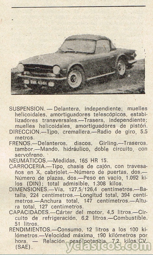 CARROCERIA: Tipo, chasis de cajón, con travesaños en X, cabriolet. Número de puertas, dos. Número, de plazas, dos. Peso en vacío, 1.092 kilos (DIN); total admisible, 1.308 kilos.