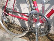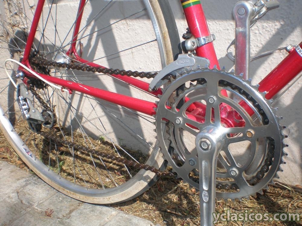 Lleva asiento San Marco Tecno Dinamica. Llantas de aluminio Nisi. Manetas de freno nuevas a estrena. Pinzas de freno CLB. Manetas del cambio, cambio trasero y desviador Huret. Pedales c/calapies Rossignol. Bielas, platos, horquilla, direccion y bujes Bh.