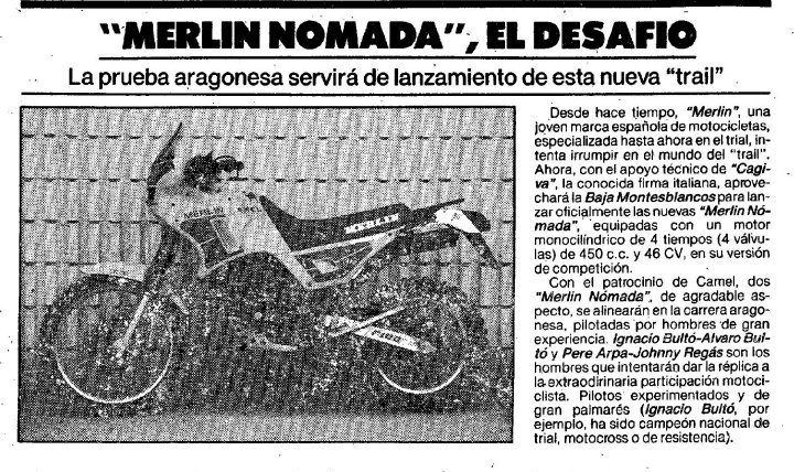 Vendo una de las dos unidades de merlin nomada 500 utilizada para la presentación de la moto. Dicha unidad fué pilotada por los hermanos Álvaro e Ignacio Bultó en la Baja Montesblancos posteriormente denominada baja aragón y actualmente baja españa de 1987. dicha unidad fué comprada por mi despues de casi tres años de negociación. La moto llevaba mas de quince años dada de baja y se encontraba sin documentación y en pésimo estado. la compré en abril del 2011 y la hice restaurar por los profesionales de MOTODISSENY Cambrils y FRTSWORLD Reus. Color Camel.