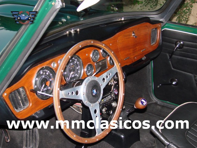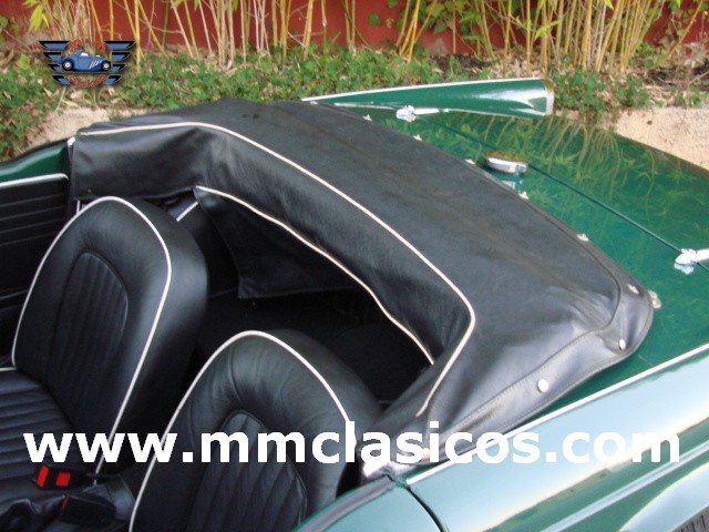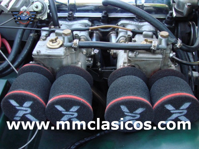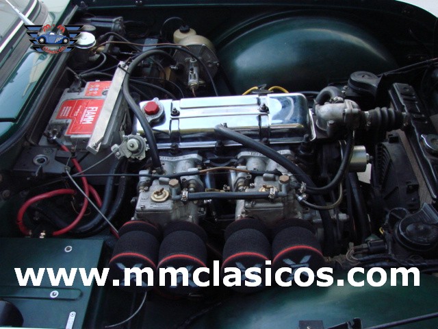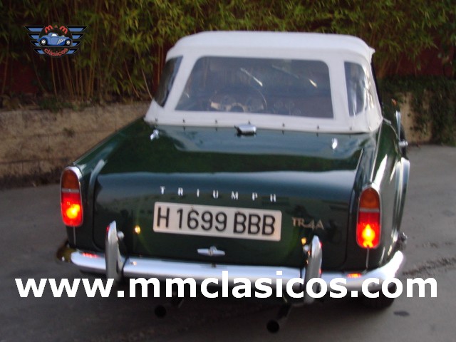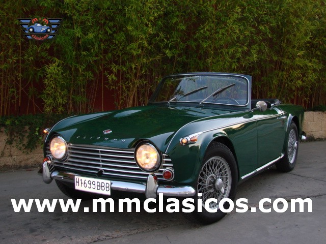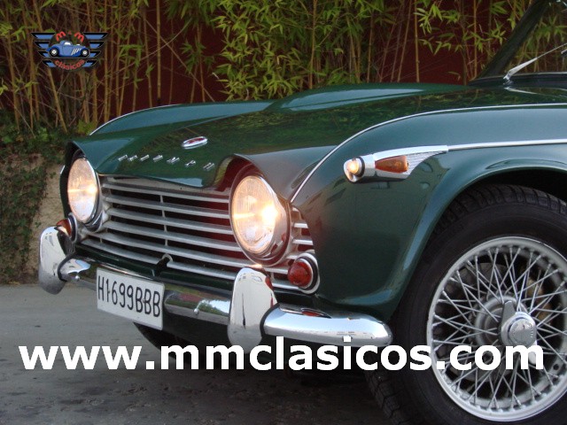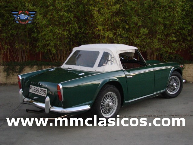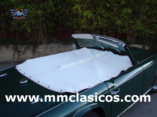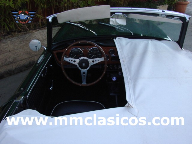 Nuestro TR4 se encuentra en un excelente estado. Toda la carrocería y chasis ha sido restaurada con tornillería, gomas, etc nuevas. La pintura es impecable en verde inglés con aplicación de química anticorrosiva moderna. Mecánicamente el motor está preparado para gasolina sin plomo y rinde 130CV. Dispone de admisión deportiva con dos carburadores deportivos Weber que mejoran el rendimiento y puesta a punto. Monta electro-ventilador y alternador. Los colectores de escape y la doble línea de escape son High Performance de acero inoxidable. El sistema de frenos está reforzado con servofreno y pinzas grandes de doble pistón en los discos delanteros. Barra estabilizadora y amortiguadores deportivos. Todos estos elementos son nuevos o de reciente restauración, al igual que otros como motor de arranque, bomba de gasolina, agua, etc. La caja de cambios de cuatro velocidades monta sobremarcha overdrive al volante. El interior esta restaurado en piel genuina negra con perfiles blancos. Monta volante de madera y aluminio Monolita. La capota es nueva en color blanco. Dispone de dos cubrecapotas. Monta cuatro llantas de radios con neumáticos radiales.