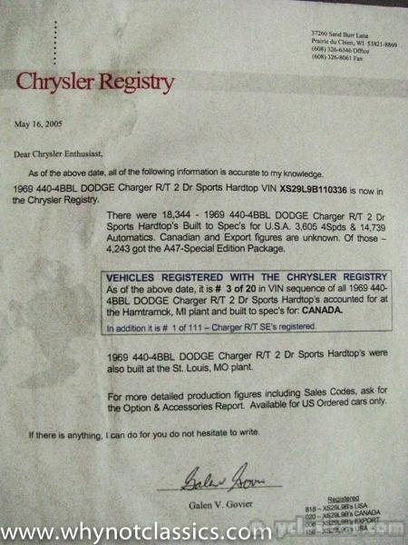 El coche se ha registrado en el Registro de Chrysler, una copia del certificado se puede ver en la sección de fotos .