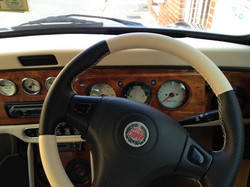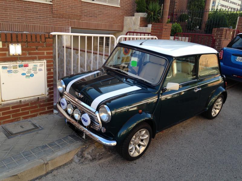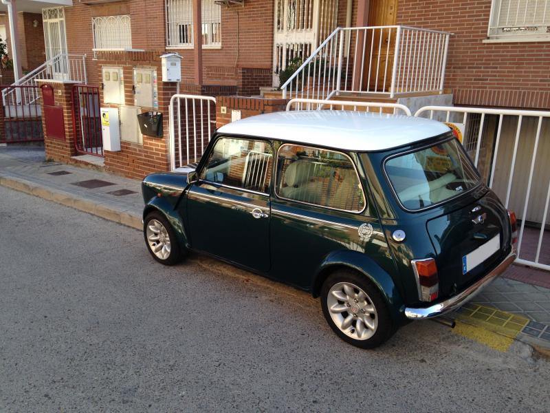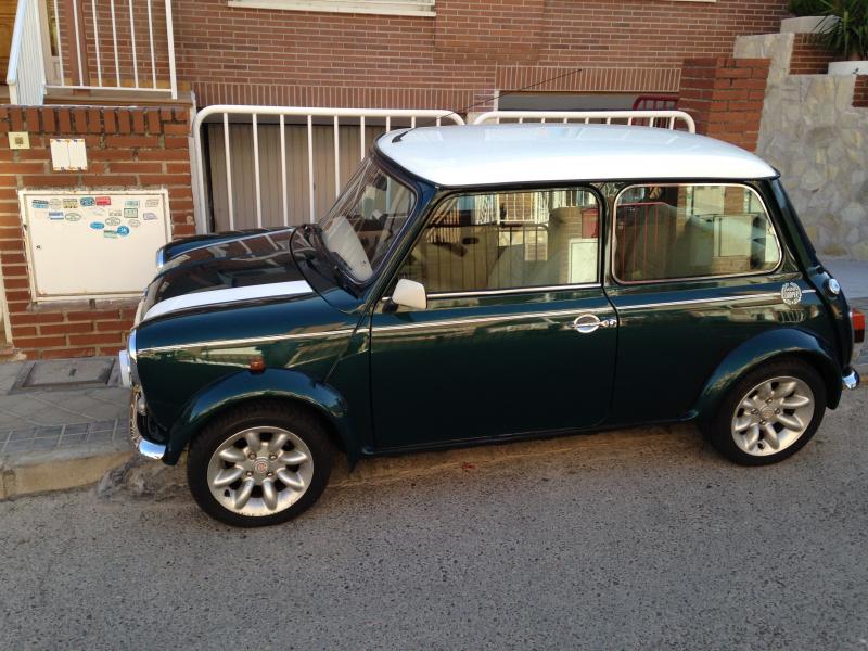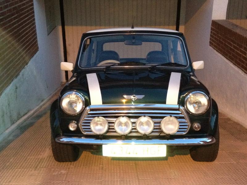 Exterior: Mini Cooper 1.3i Sportpack BRG, aletines anchos, techo, espejos y bandas de capo en blanco, neumáticos anchos 175/50/13 con llantas originales 6x13, faros delanteros antiniebla y largo alcance, antiniebla trasero. Pintado completamente en 2013.