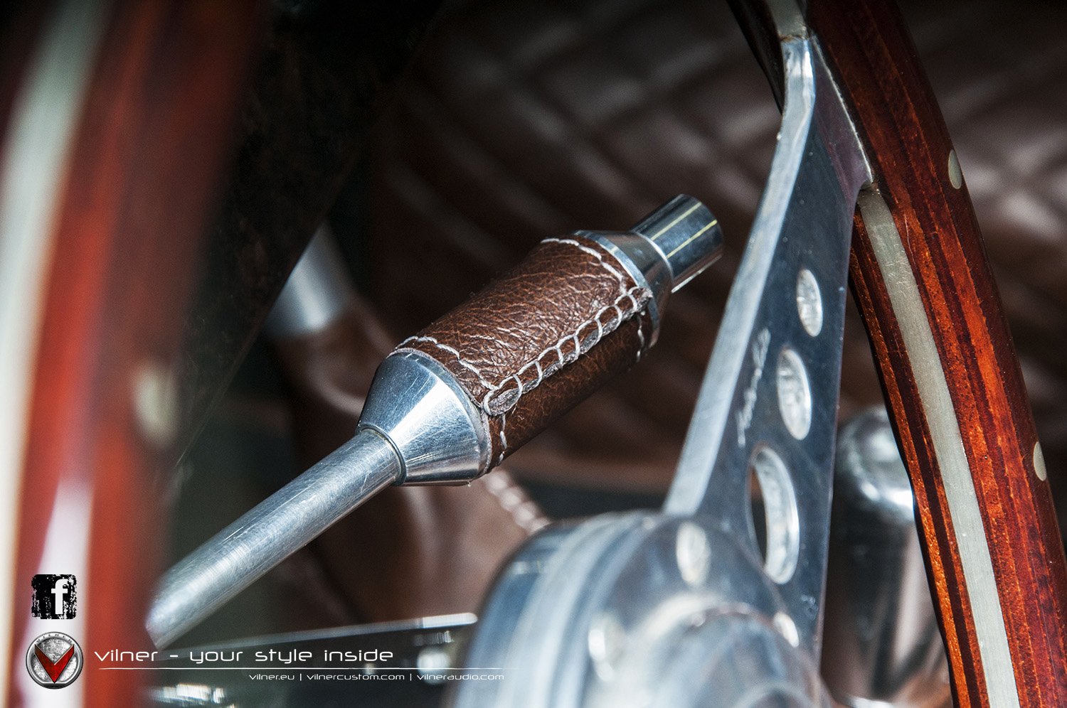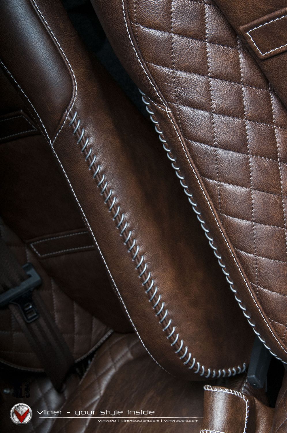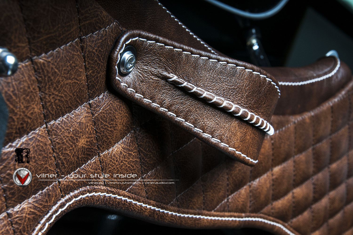 La tapicería lisa gris y blanca deja su lugar a un tapizado de piel marrón acolchada, que tanto gusta a los ingleses y que tanto emplea por ejemplo Bentley en sus modelos, con guateado de rombos en algunos lugares, así como costuras realizadas a mano con hilo blanco y tiras de cuero teñidas de color plata. Se ha tapizado incluso los cierres de los cinturones de seguridad y los sistemas de cierre de las puertas, que se encontraban totalmente a la vista, ahora están cubiertos de Alcántara de color negro. Vilner ha cambiado incluso todos los tornillos que están a la vista por un nuevo juego con cabezas brillantes para que hicieran juego con los radios del volante.