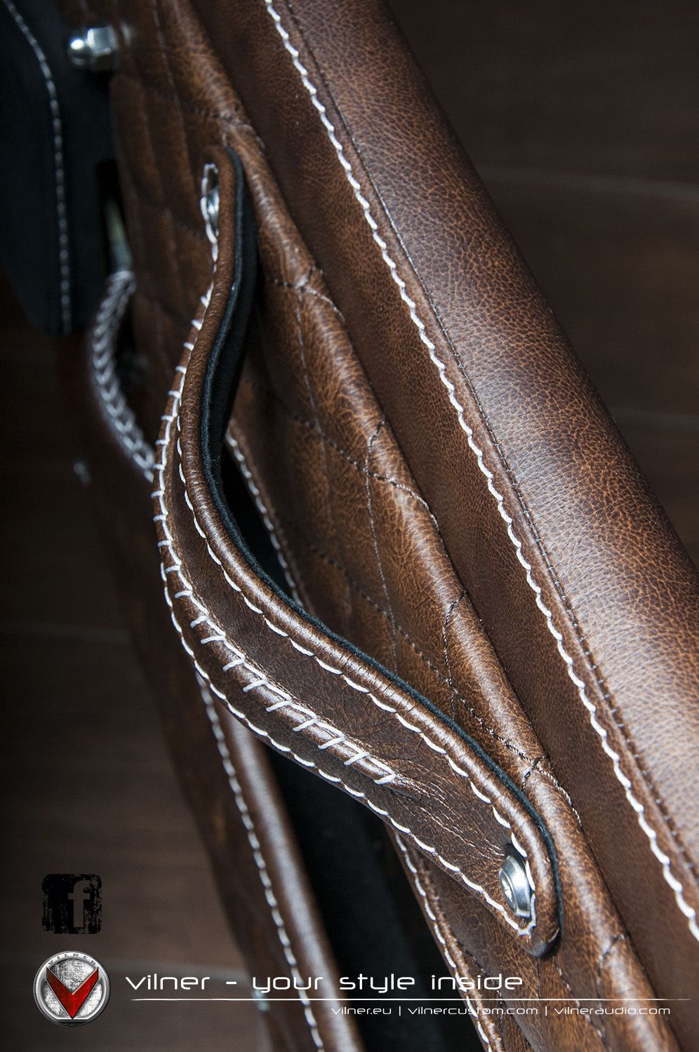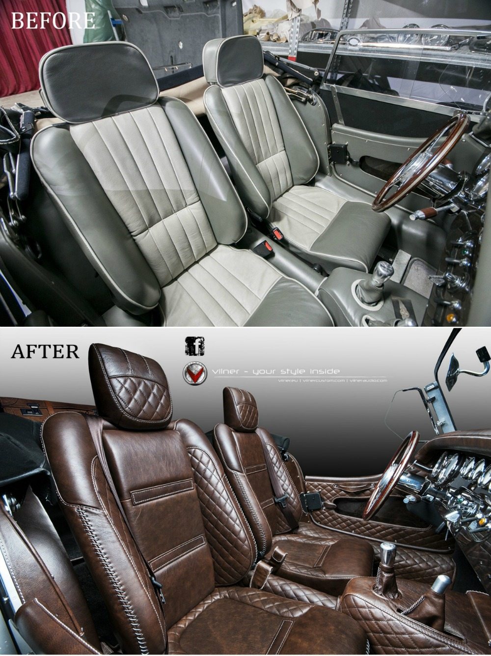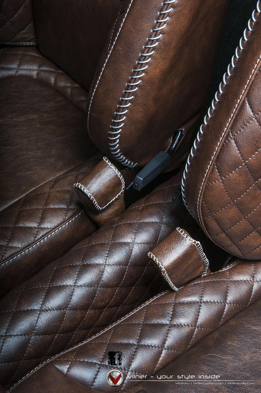 La tapicería lisa gris y blanca deja su lugar a un tapizado de piel marrón acolchada, que tanto gusta a los ingleses y que tanto emplea por ejemplo Bentley en sus modelos, con guateado de rombos en algunos lugares, así como costuras realizadas a mano con hilo blanco y tiras de cuero teñidas de color plata. Se ha tapizado incluso los cierres de los cinturones de seguridad y los sistemas de cierre de las puertas, que se encontraban totalmente a la vista, ahora están cubiertos de Alcántara de color negro. Vilner ha cambiado incluso todos los tornillos que están a la vista por un nuevo juego con cabezas brillantes para que hicieran juego con los radios del volante.