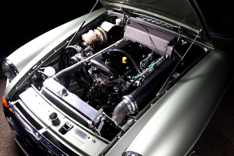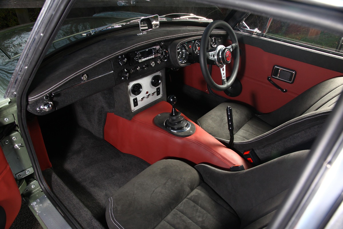 También se ha realizado desde cero el habitáculo, con un nuevo salpicadero con instrumentación Smith y un volante original del MGB-GT, acompañado de nuevos asientos tipi 'bucket' aunque de estilo retro, sin reposacabezas. El tapizado es de Alcántara y el resultado, sobresaliente. Por supuesto, el equipo de audio 'tope de gama' y las conexiones auxiliares están todas presentes. Por si fuera poco, se ha insonorizado todo el habitáculo usando 'Dinamat', algo que no me termina de convencer por completo pues el mayor mal que tienen los coches modernos ese justamente ese, que están excesivamente aislados.