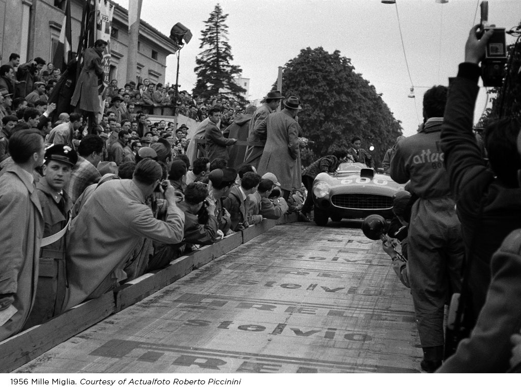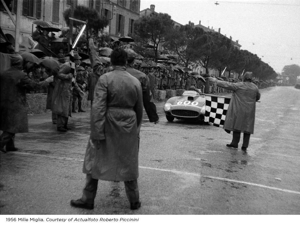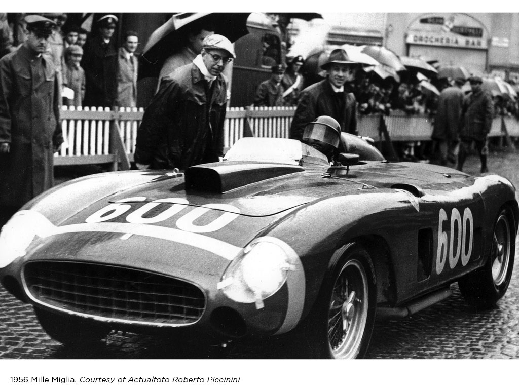 Del Ferrari 290 MM se construyeron únicamente cuatro ejemplares y el de las imágenes, se hizo en exclusiva para Fangio, con una decoración especifica y pensado para que el piloto argentino compitiera en las famosas Mille Miglia. Pero Juan Manuel Fangio no fue el único que pilotó esta unidad, por si fuera poco importante la figura del argentino, hay que sumar que Portago también se puso a los mandos en alguna ocasión y también Von Trips. Nombres que ya por si solos, sumar valor a la unidad. Fangio compitió en la Mille Miglia de 1956 terminando en cuarta posición y posteriormente, ganando el los 1.000 km de Buenos Aires, mientras que Alfonso de Portago participó en los 1.000 km de Nürburgring y en el Rouen Grand Prix también en 1956. Von Trips por su parte, y también en 1956, corrió la Sveriges Sport Car GP.