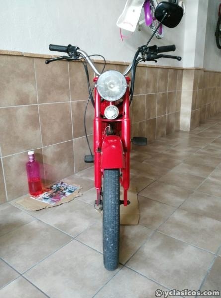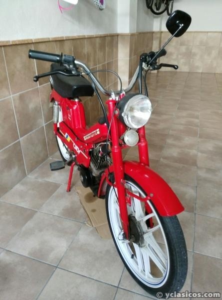 Mobylette Cady E-14. Color rojo. Funcionando y matriculada con placa amarilla. Todo de origen. LLantas de aleación color blanco. Muy cuidada y bien conservada. Documentación al día a falta de ITV. Necesitaría pequeño repaso mecánico. Conservo cesta delantera y transportin trasero.