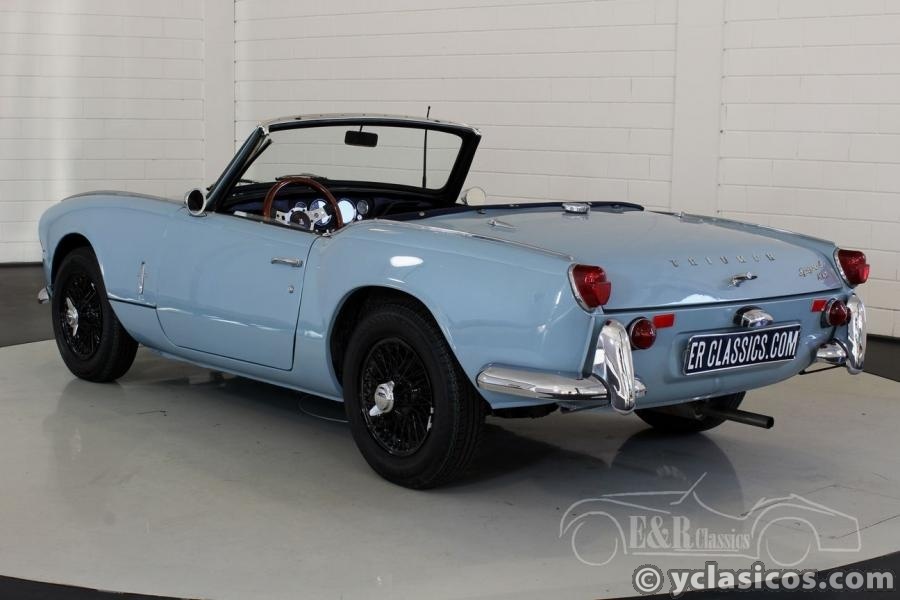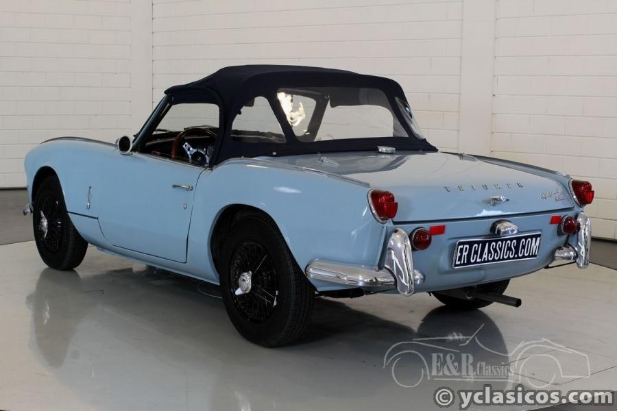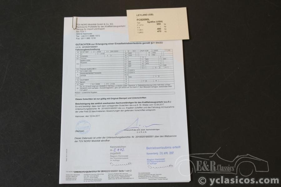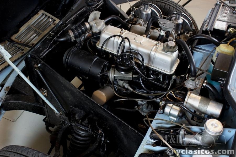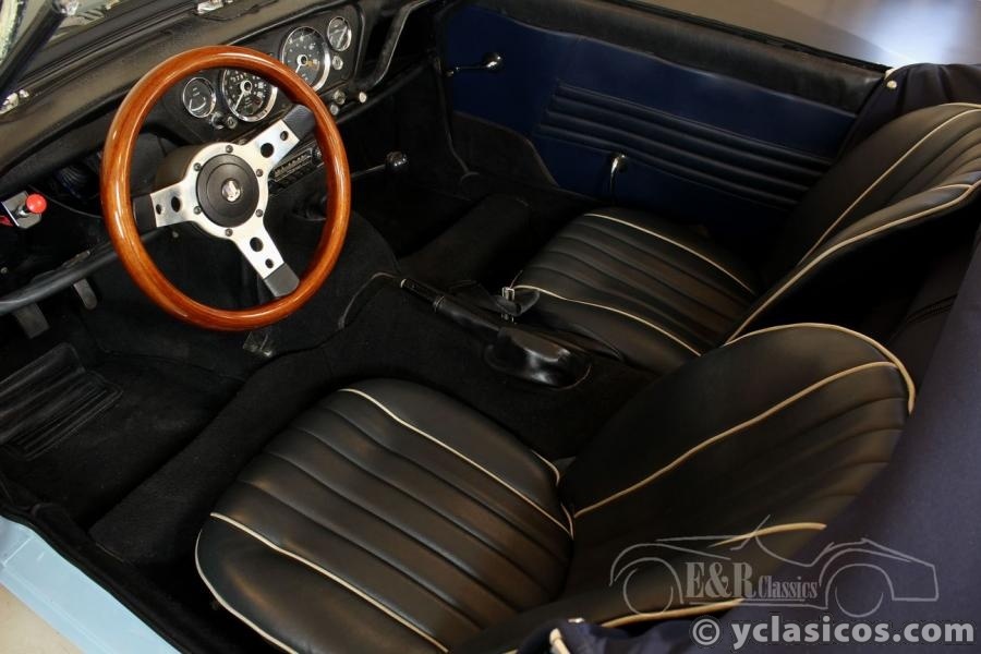 This is a 1967 Triumph Spitfire Mark II cabriolet. Painted in a marvellous colour combination of Wedgewood Blue with a dark blue interior. Both the in- and outside are in a very beautiful and very well maintained condition. Furthermore the car is provided with a dark blue Sonnenland soft top and cover, wire wheels and a wooden steering wheel. The MKII is the most rare of the Spitfire range and that makes him even more special. So a very beautiful and very rare Spitfire.