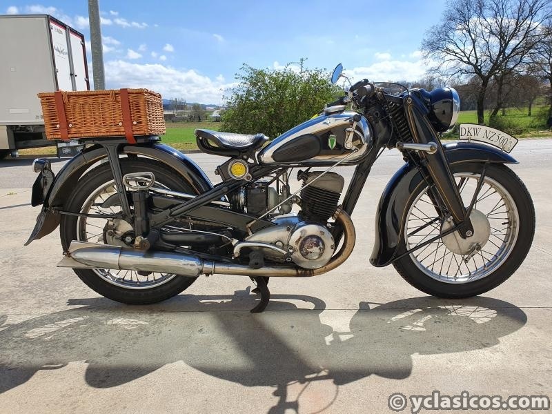 Magnífica DKW NZ500, de 500 cc., estas motos alemanas se fabricaron entre el 1939 y el 1941, totalmente restaurada, en muy buen estado, documentación totalmente al dia, con matrícula nacional de la época, funciona y rueda perfectamente.