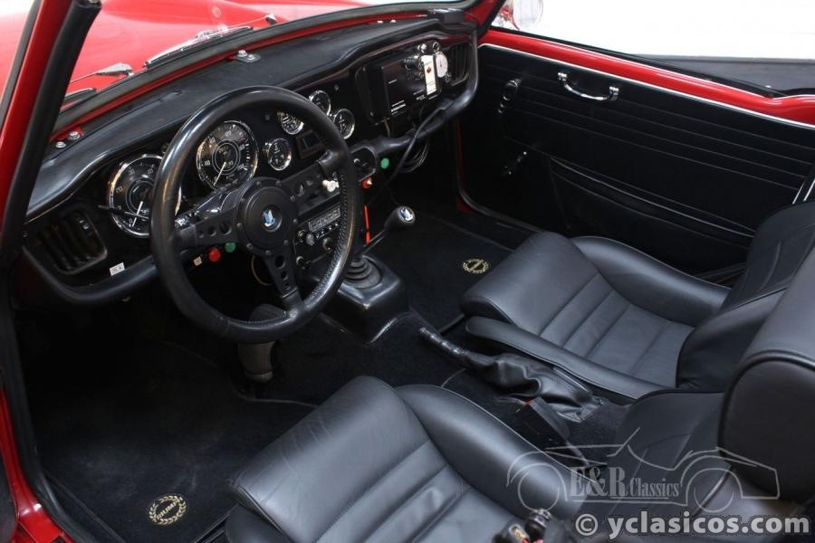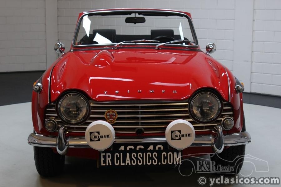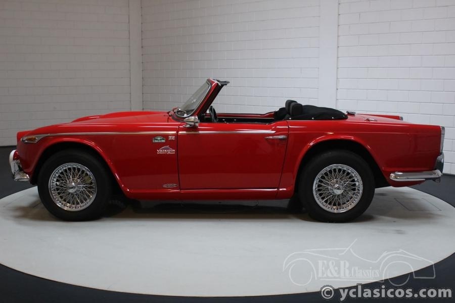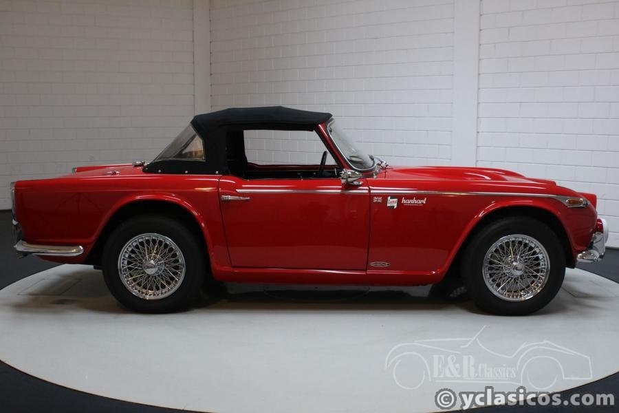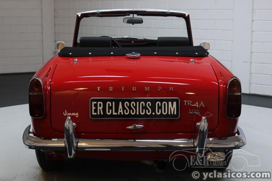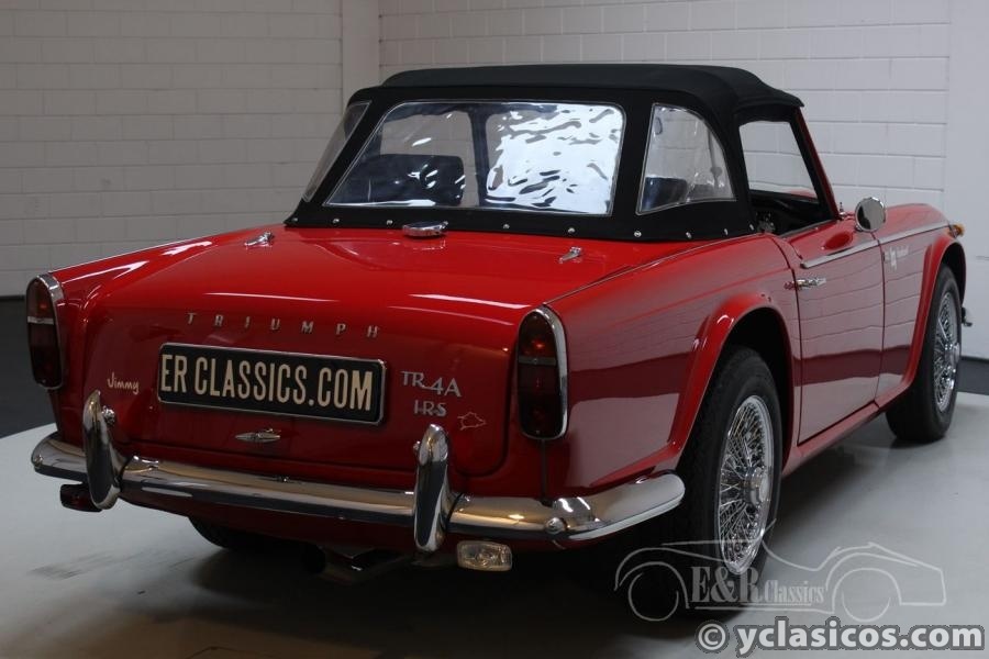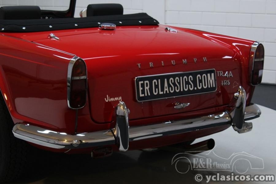 This beautiful Triumph TR4A IRS was built in 1966. The car has been in possession of a true enthusiast in recent years, who has maintained the TR4 very well both optically and technically. Various invoices are present. The red paintwork, black mohair soft-top and the interior with luxury seats are in beautiful condition. This Triumph TR4A with 2138cc four-cylinder engine is equipped with independent rear suspension, the IRS version. This greatly improved the driving comfort and handling of the TR4. On the outside, this was characterized by Triumph by applying an IRS emblem on the back of the car. In addition, this classic English cabriolet is equipped with chrome wire wheels and an Overdrive. In summary, a beautiful English classic that you will certainly enjoy!