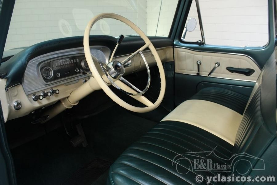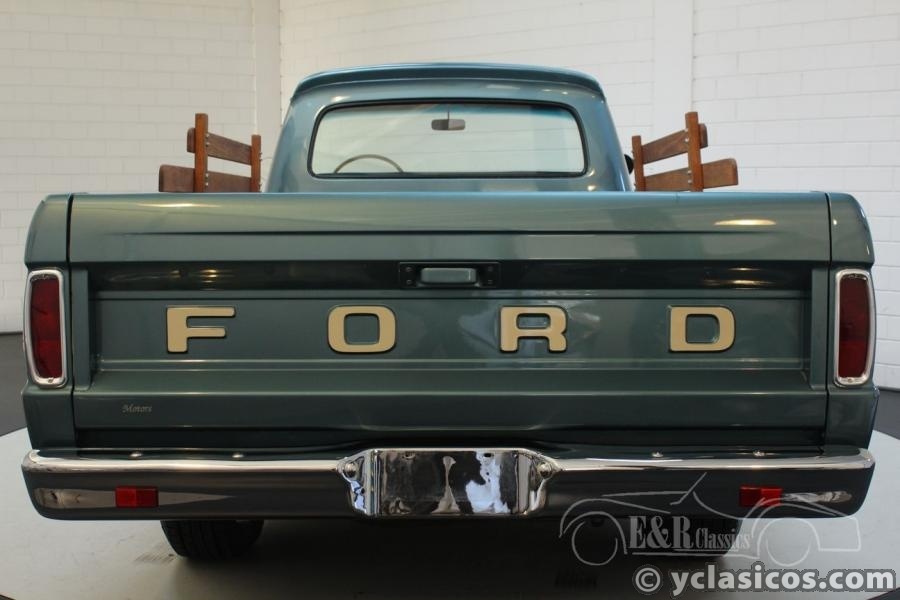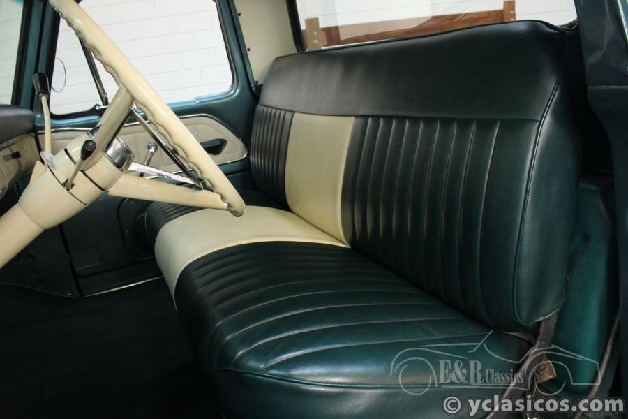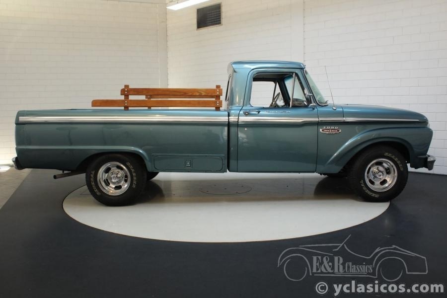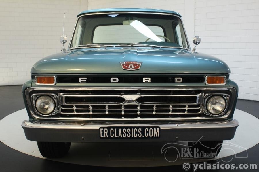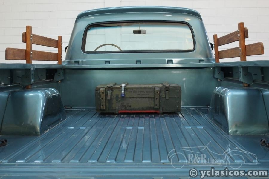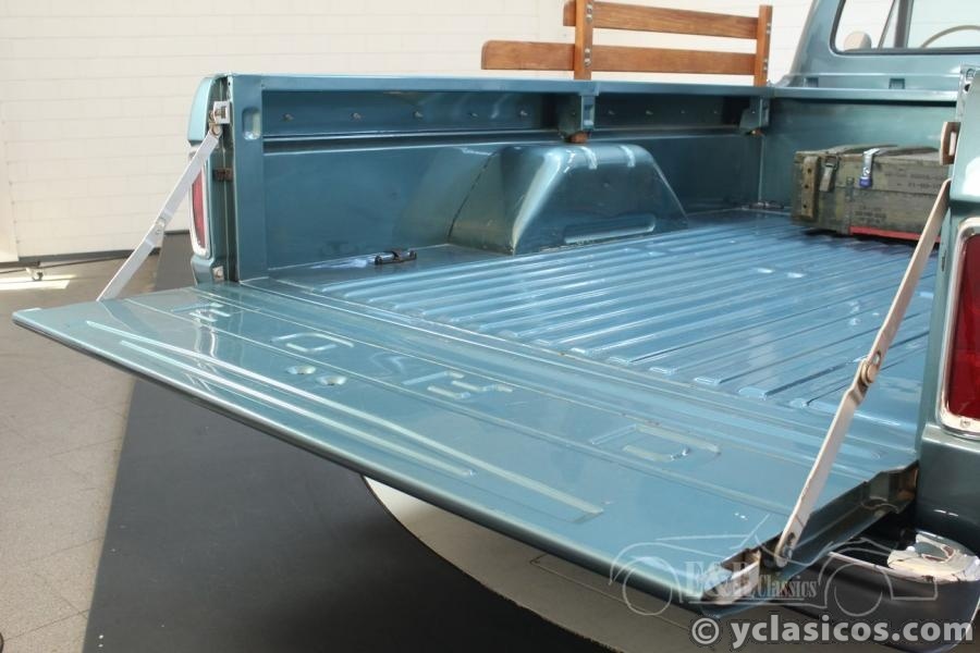 This Ford F100 Custom Cab Pickup was built in 1966 and is from the fourth generation Ford F-series. The strong 5.7L V8 engine with automatic gearbox and the upgrade with Twin I-beam front suspension that the F100 received after '65, ensure that this classic pickup drives very well. Of course with the wonderful engine sound in the background that belongs to such a classic American. The blue metallic paintwork, the chrome parts and the alloy wheels are in beautiful condition. With the retro blue with white interior, you immediately feel like you're in the sixties! Are you looking for an American pickup in beautiful condition? Contact us for more information about this Ford F100 Custom Cab.